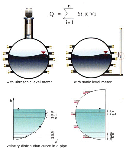 A special version of UR-1000 using velocities measured by multiple ultrasonic transducers and the fluid level measured by the sonic level meter or ultrasonic level meter to calculate area(s). Flow volume is calculated by dividing the area into n sub-areas.